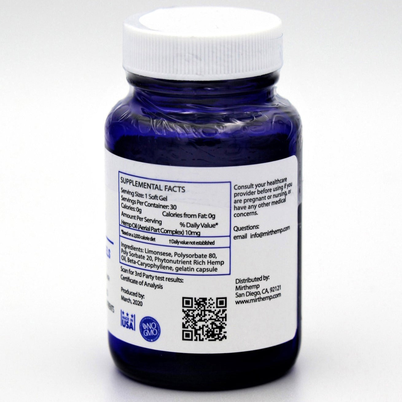 Ingredients: Limonene, Polysorbate 80, Polysorbate 20, Phytonutrient Rich Hemp Oil, Beta-Caryophyllene, gelatin capsule